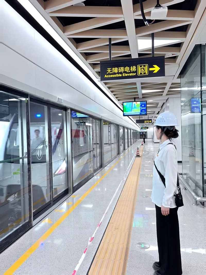 雙節(jié)期間,站務(wù)人員在站臺(tái)指定位置,投入列車試運(yùn)行接發(fā)工作,提前確認(rèn)進(jìn)路信號(hào)與站臺(tái)安全,緊盯車門與屏蔽門對(duì)位,確保列車平穩(wěn)??俊踩稣?。空載試運(yùn)行階段的車站雖無熙攘的客流,但有工作人員堅(jiān)守的溫度。